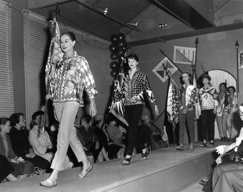 From the very beginning of his fashion career, Pucci was interested in experimenting with materials. In 1953, with Legler, he produced synthetic velvets for sports pants, and in the same year he worked with cotton producers Valle Susa to create printed wally pliss. In 1954 Pucci made famous a new jersey for the production of lightweight, crease-proof clothing.