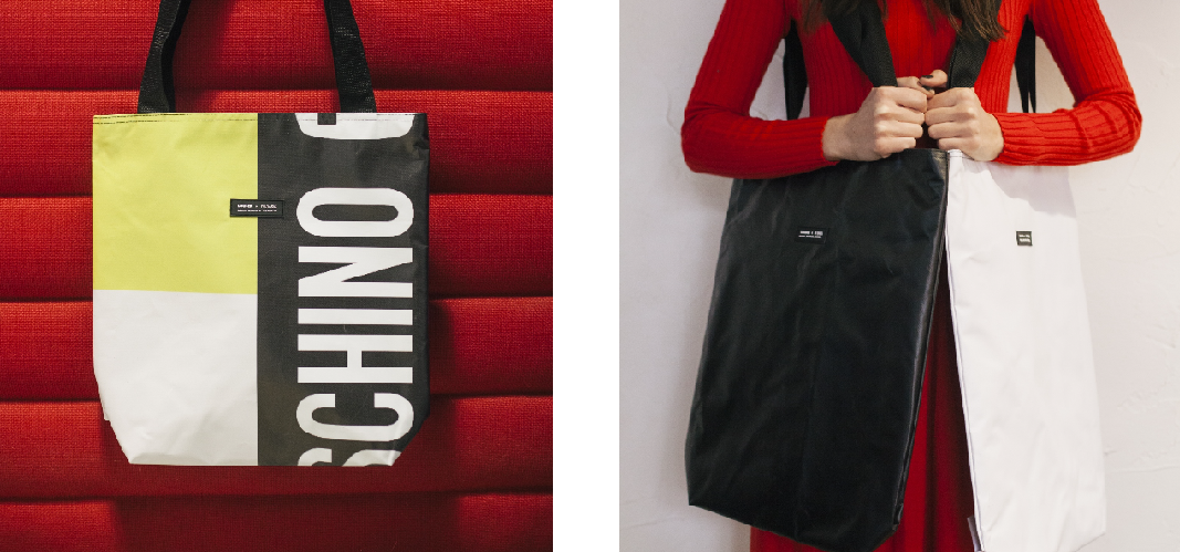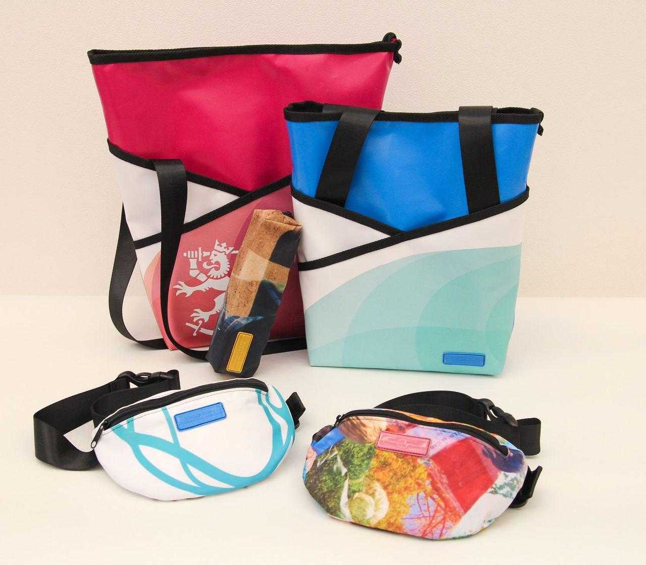 Из баннеров, которые раньше использовались Генеральным консульством Финляндии, 99RECYCLE сделали большие и маленькие шоперы, поясные сумки и пеналы. На каждом экземпляре — бирка из переработанного пластика HDPE
