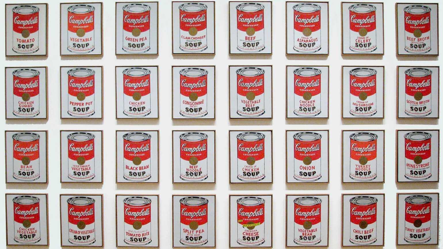 Поп-арт Уорхола — это переосмысление эпохи потребления. В некоторых работах он перерисовывал от руки образы, тиражируемые в массовой культуре. Например, это холсты с супом Campbell.