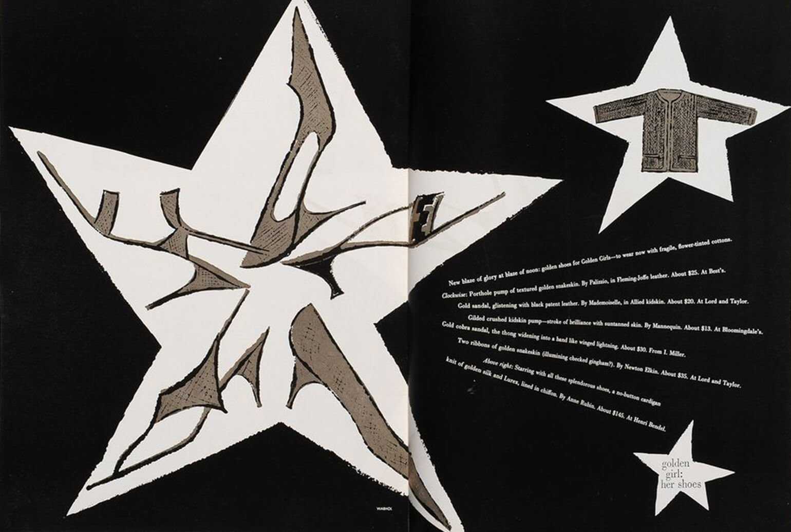 Реклама туфель I.Miller на развороте Harper’s Bazaar, 1960 год. Изображение: Энди Уорхол / Harper’s Bazaar / The Andy Warhol Foundation for the Visual Arts, Inc. / Artists Rights Society (ARS), New York