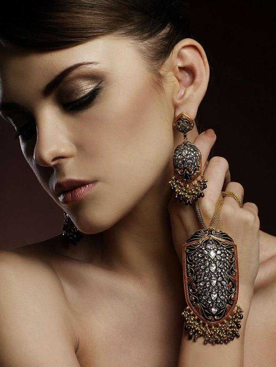 Тенденция к массивности не обошла и серьги. Они могут быть визуально весьма тяжелыми, с вычурными плетениями, инкрустацией, обилием драгоценных камней и их имитаций. Серьги, свисающие ниже линии плеч, сейчас не считаются признаком дурного вкуса.