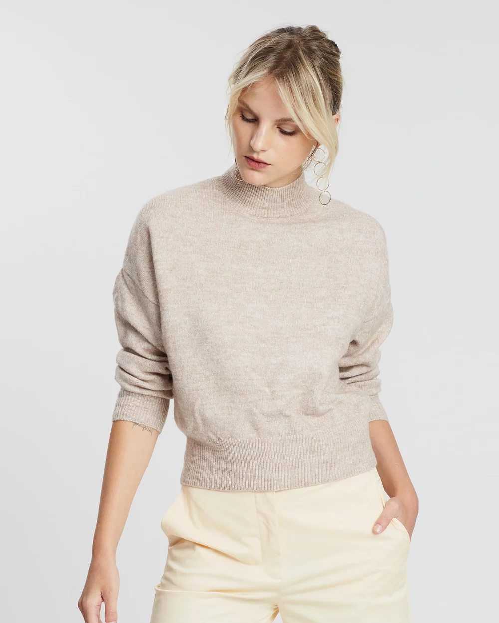 Отличной идеей будет оверсайз свитер с высоким горлом бежевого или карамельного оттенка. Для многослойных образов пригодится свободная рубашка из плотной теплой ткани, желательно в клетку или полоску