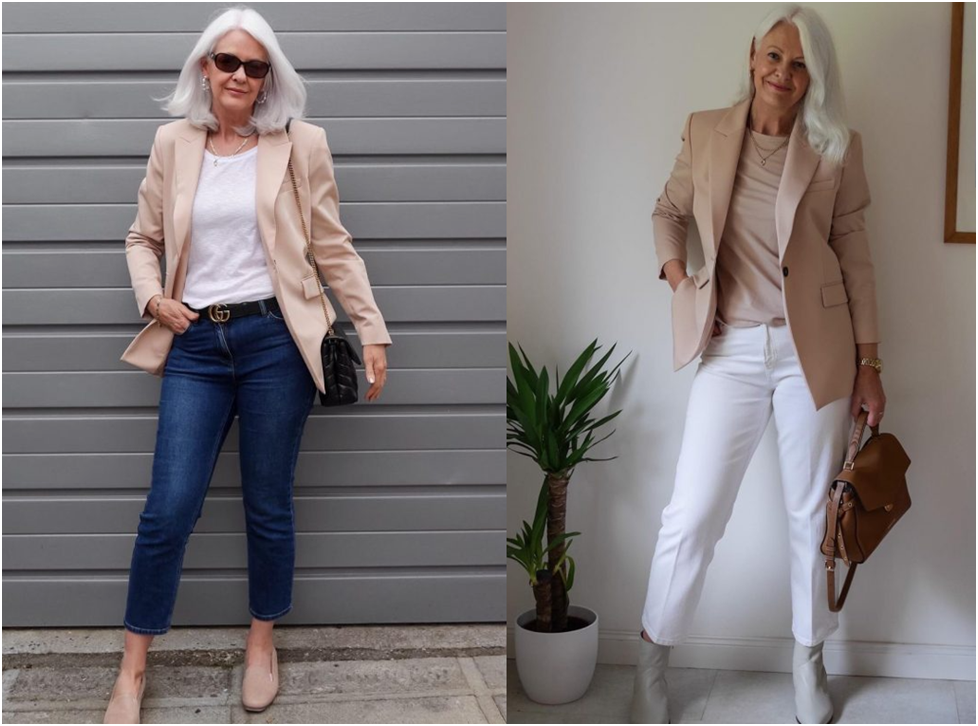 3. Блейзер прямого кроя, голубые джинсы и белая водолазка.