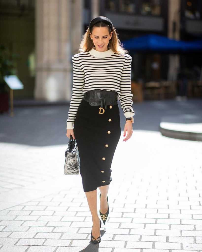 Не избегайте длинных юбок при составлении луков на каждый день. Надевайте удлиненные модели карандаш на работу и на деловые встречи, а пышные летящие силуэты оставьте для прогулок. Под прямые модели длинных юбок отлично подходят рубашка в полоску или короткий жакет.