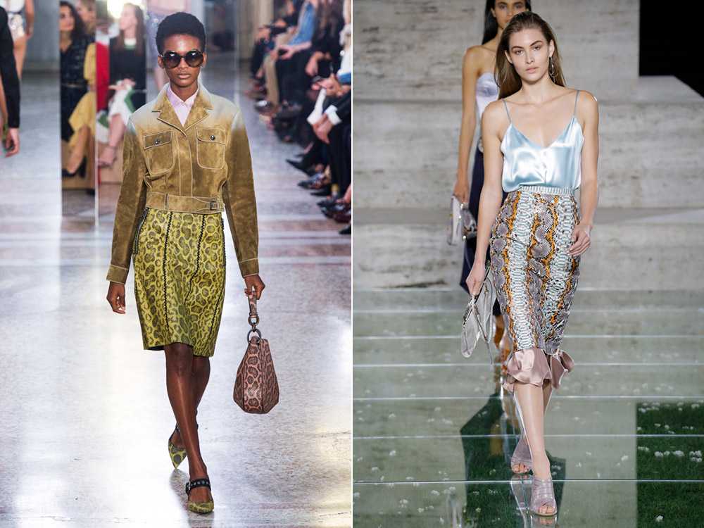 Лучше всего такой принт смотрится на прямой юбке фасона «карандаш». Змеиные полоски, проходящие вдоль силуэта, утончают его, делают фигуру изящнее. Пример такого змеиного шика – юбка от Bottega Veneta и Salvatore Ferragamo. Строгость линий может быть разбавлена оборками, которые украсили строгий крой юбки, придав ей немного легкости и воздушности.