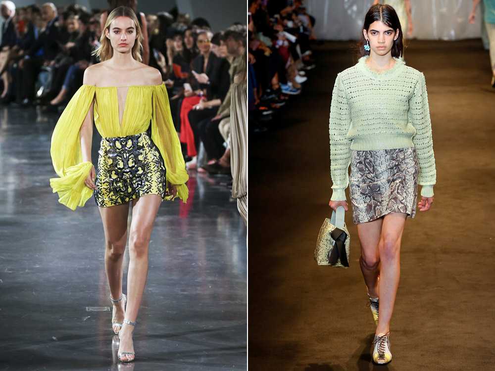 Если ты любительница коротких, прямых юбочек, то обрати внимание на модные «змеиные» мини-юбки от Mugler и Acne Studios. Стоит заметить, что некоторые дизайнеры решили дополнить образ сумочкой и туфлями с принтом под кожу рептилий