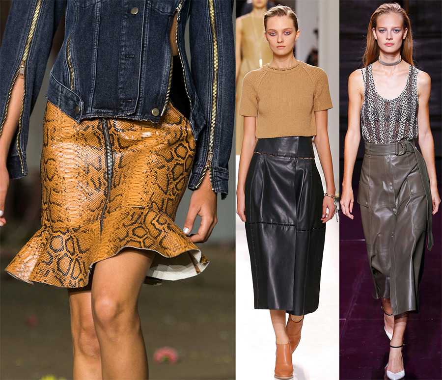 Дизайнеры не используют обильного декора в кожаных вещах, не делают отсылок к гранжу или рокерскому стилю, а вписывают юбки из кожи в городские ансамбли. Агрессия и сексуальность кожи сглаживается благодаря мягким силуэтам, использованию фасонов с баской, уходу от чёрного цвета и комбинациям с мягкими фактурами.