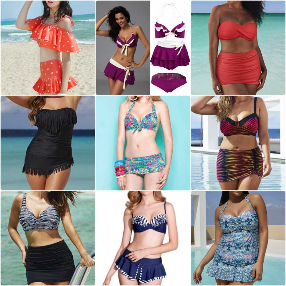 Купальник с юбочкой. Она может быть как совсем коротенькая, так и длиной как классическая мини-юбка. Некоторые разновидности подойдут девушкам, которым нужно скрыть недостатки на боках и бедрах.