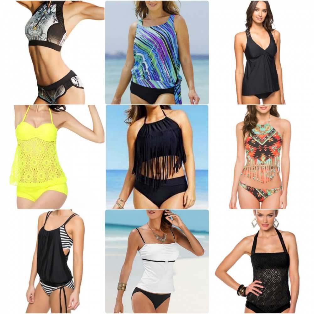 Название происходит от слова «tank-top». Это купальник с топом на широких или тонких бретелях. Топ может быть как коротким, так и длинным. Низ — обычные плавки или шортики. Эта модель хорошо подойдет тем, кому нужно скрыть недостатки в районе талии.