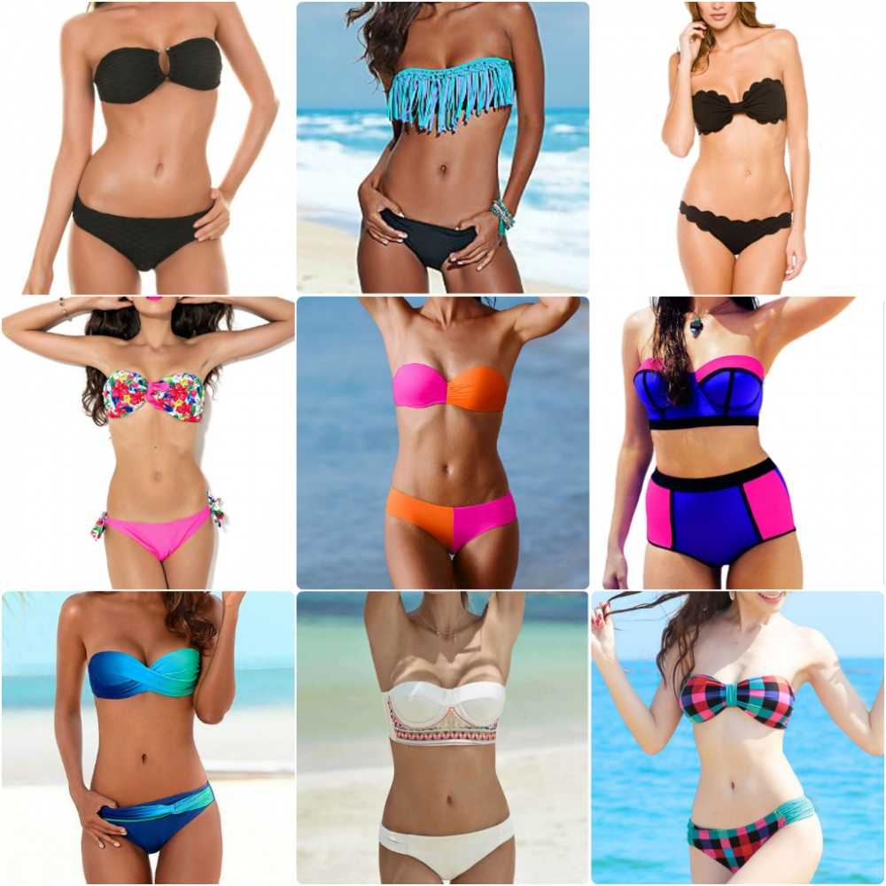 Купальник без бретелей. Верх такого купальника выполнен так, словно грудь обвязана лентой. Визуально увеличивает грудь за счет драпировки и множества мелких складок. Трусики тоже бывают с драпировкой, так что можно подобрать разновидность и под неширокие бедра. Бандини — это тот же бандо, но с топом.