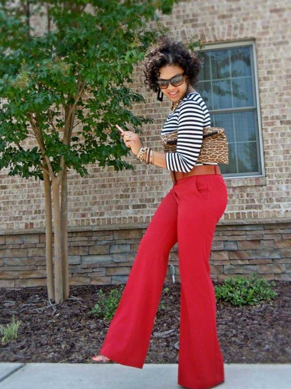 Брюки клеш от колен со стрелками — идеальный вариант для невысоких женщин с хорошими пропорциями. Он сделает ноги длиннее, а силуэт стройнее. Если бедра узкие, рекомендуется подобрать модели с накладными карманами.