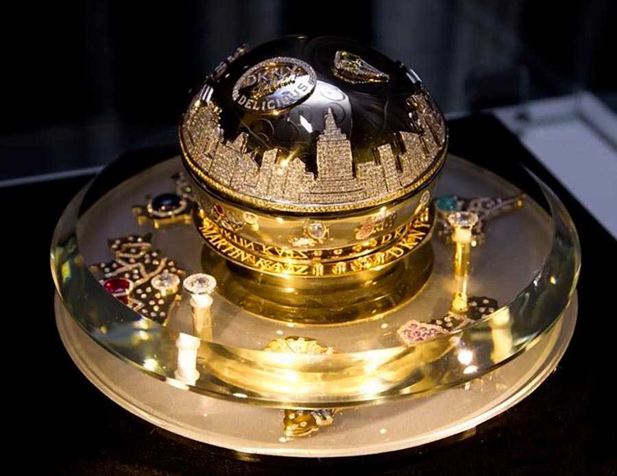Что же может стоить так дорого и оцениваться в целый миллион долларов? Конечно же, флакон! В 2011 году бренд DKNY решил «одеть» свой популярный аромат «Golden Delicious» в драгоценные одежды. Флакон остался все той же традиционной круглой формы в виде яблока, но его украсили 2909 драгоценными камнями, сымитировав панораму небоскребов Нью-Йорка. На инкрустацию потратилось более 1500 часов, а работами занимался ювелир Мартин Катц. Флакон в мире всего один, он изготавливался с целью передачи вырученных средств в благотворительный фонд борьбы с голодом.