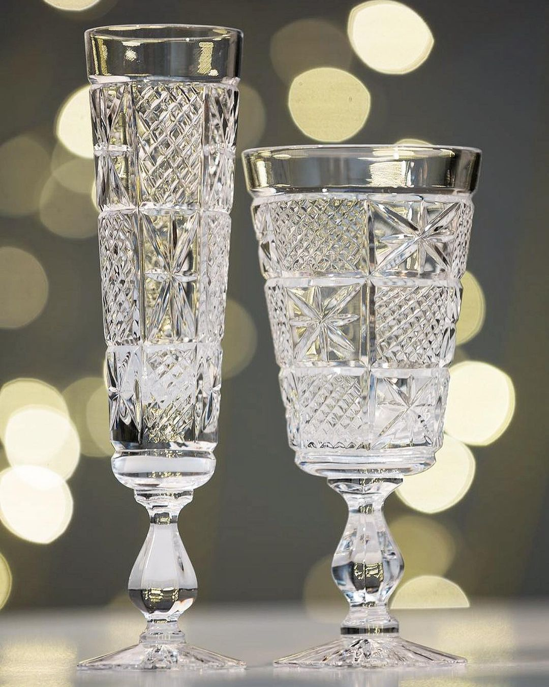 Хрустальную посуду часто декорируют. Одни художники — золотом, вплавляя золотую фольгу в само стекло или покрывая снаружи. Другие расписывают стекло вручную. Используют метод травления плавиковой кислотой, от этого изделие приобретает особый блеск. Иногда посуду обрабатывают острозернистым песком, от этого поверхность становится дымчатой.