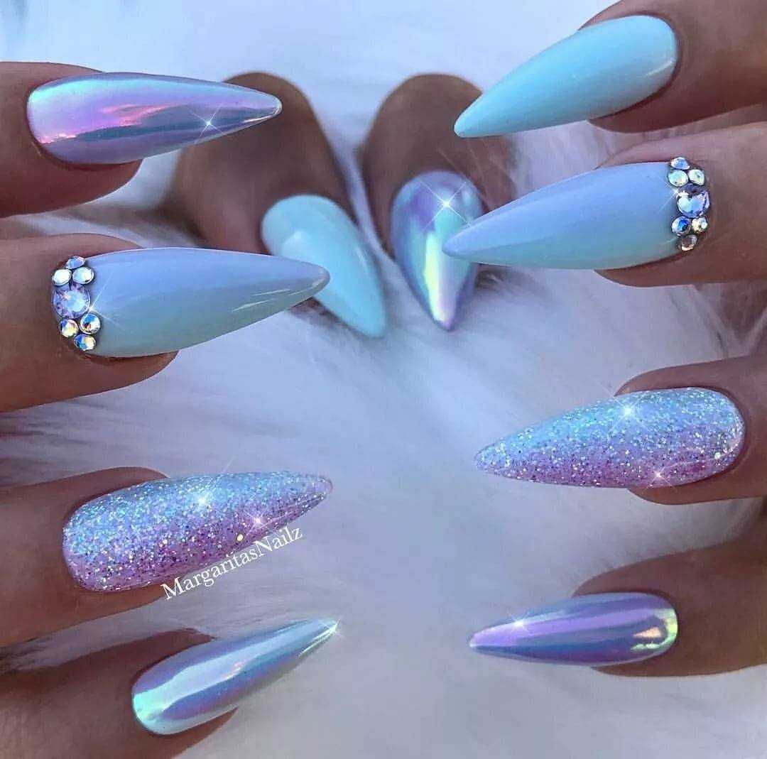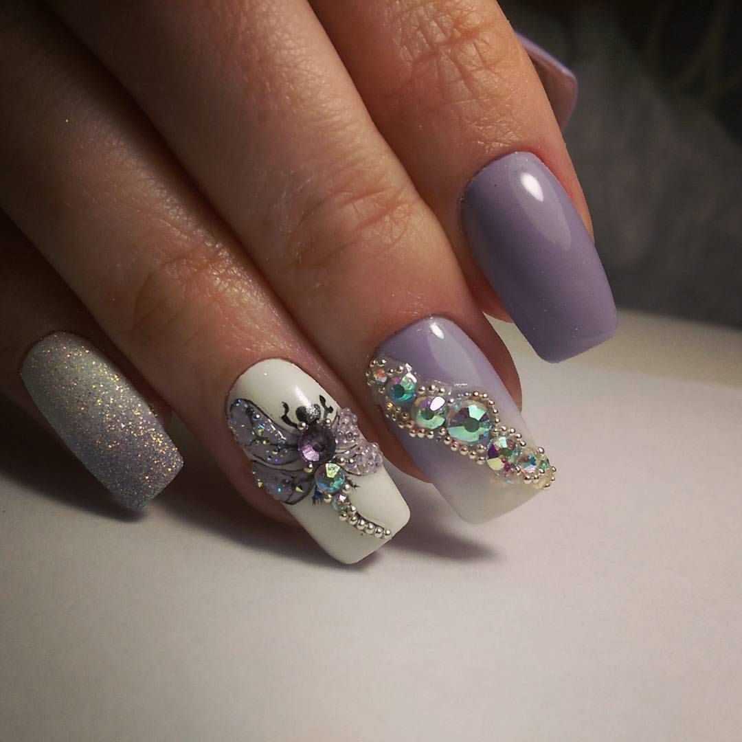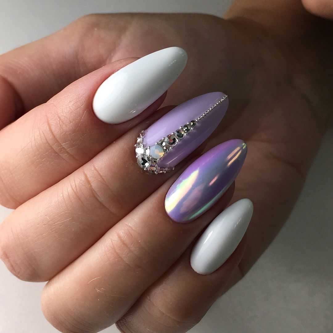 Помимо блесток используйте новинку в нейл-дизайне – втирку, фольгу, технику «битое стекло». Стразы также можно отнести к блестящему декору, настолько красиво и нежно они переливаются на ноготках.