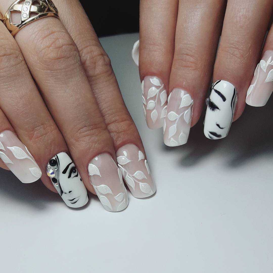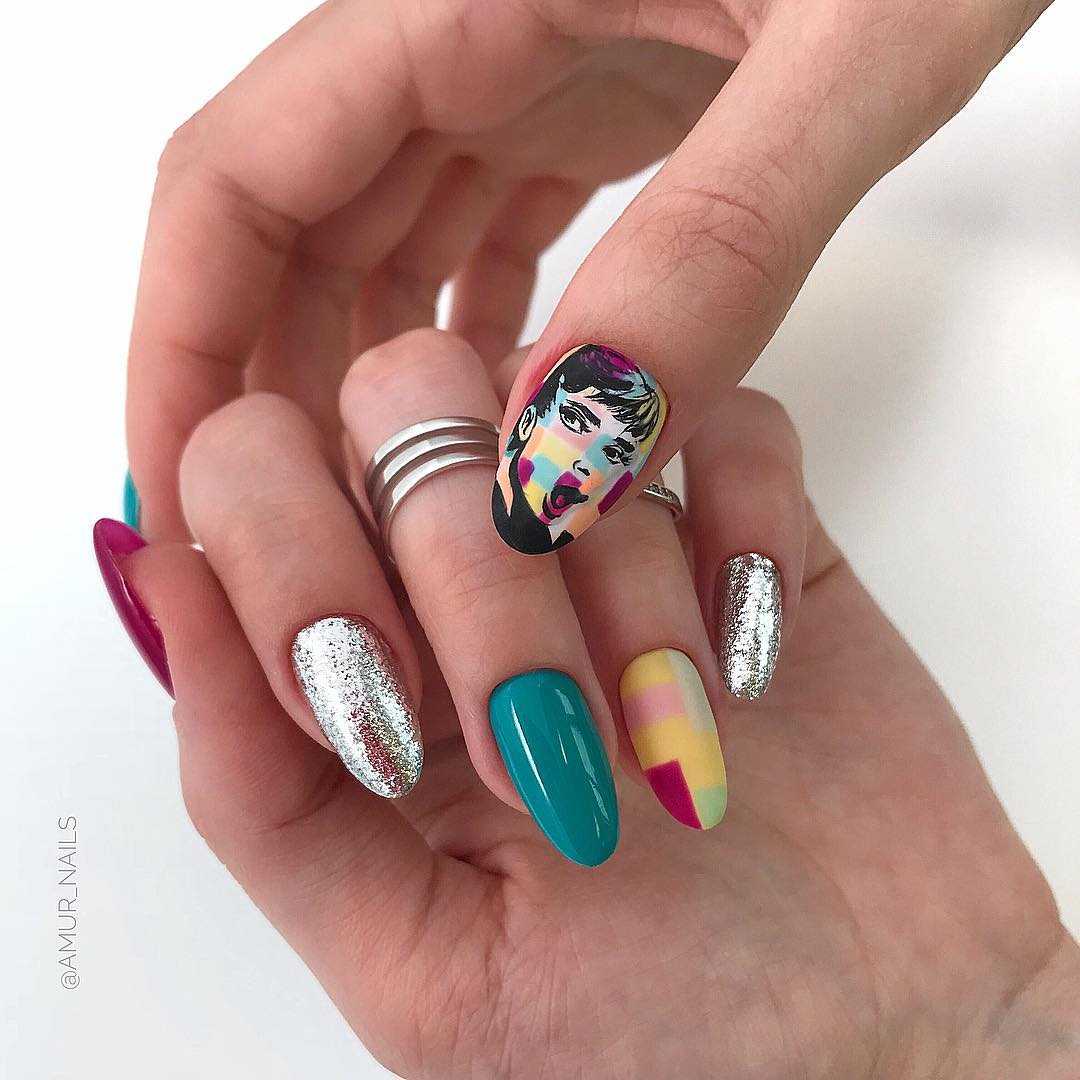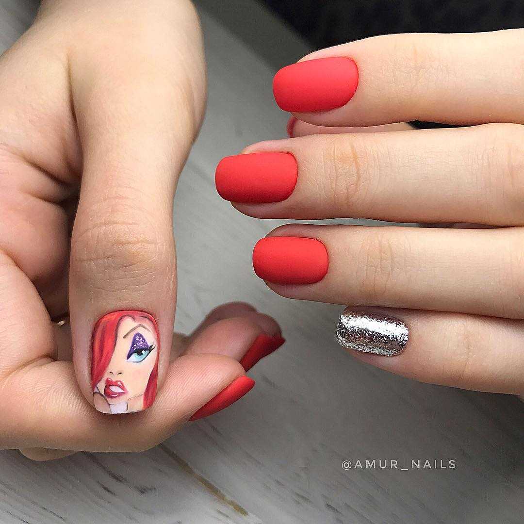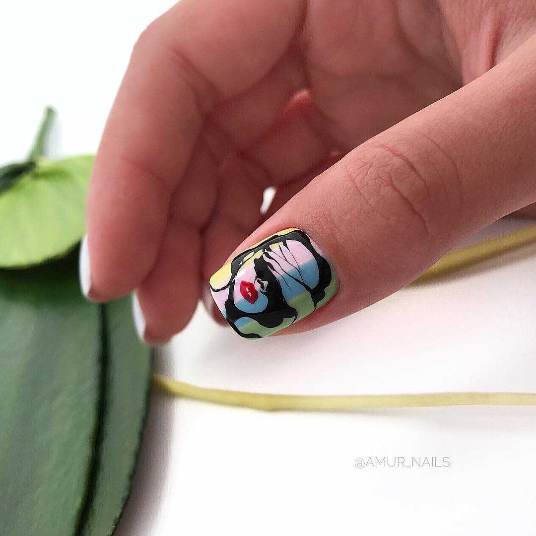 Маникюр с портретами по сути является продолжением тренда с надписями. С помощью изображения вы можете показать окружающим своих кумиров, рассказать о своих предпочтениях и характере. Помимо медиа-личностей, культовых певцов и других знаменитостей размещайте на ногтях героев мультфильмов. Такой маникюр выглядит весело и ярко, отлично вписывается в летний или тематический образ.