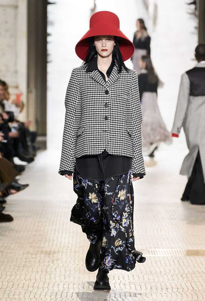 Жакет с принтом гусиная лапка стал новой классикой в современных образах: дизайнеры Nina Ricci в этом сезоне показали непривычное сочетание классического жакета и ярко-красной шляпы необычной формы – получилось современно и актуально. Оказалось, что жакет с принтом гусиная лапка идеально сочетается не только с брюками и джинсами, но и с юбкой макси из летящей ткани с цветочным принтом. А для того, чтобы уравновесить романтичный образ, дизайнеры предлагают сделать ставку на грубые черные ботинки, идеальные для дождливой осенней погоды.