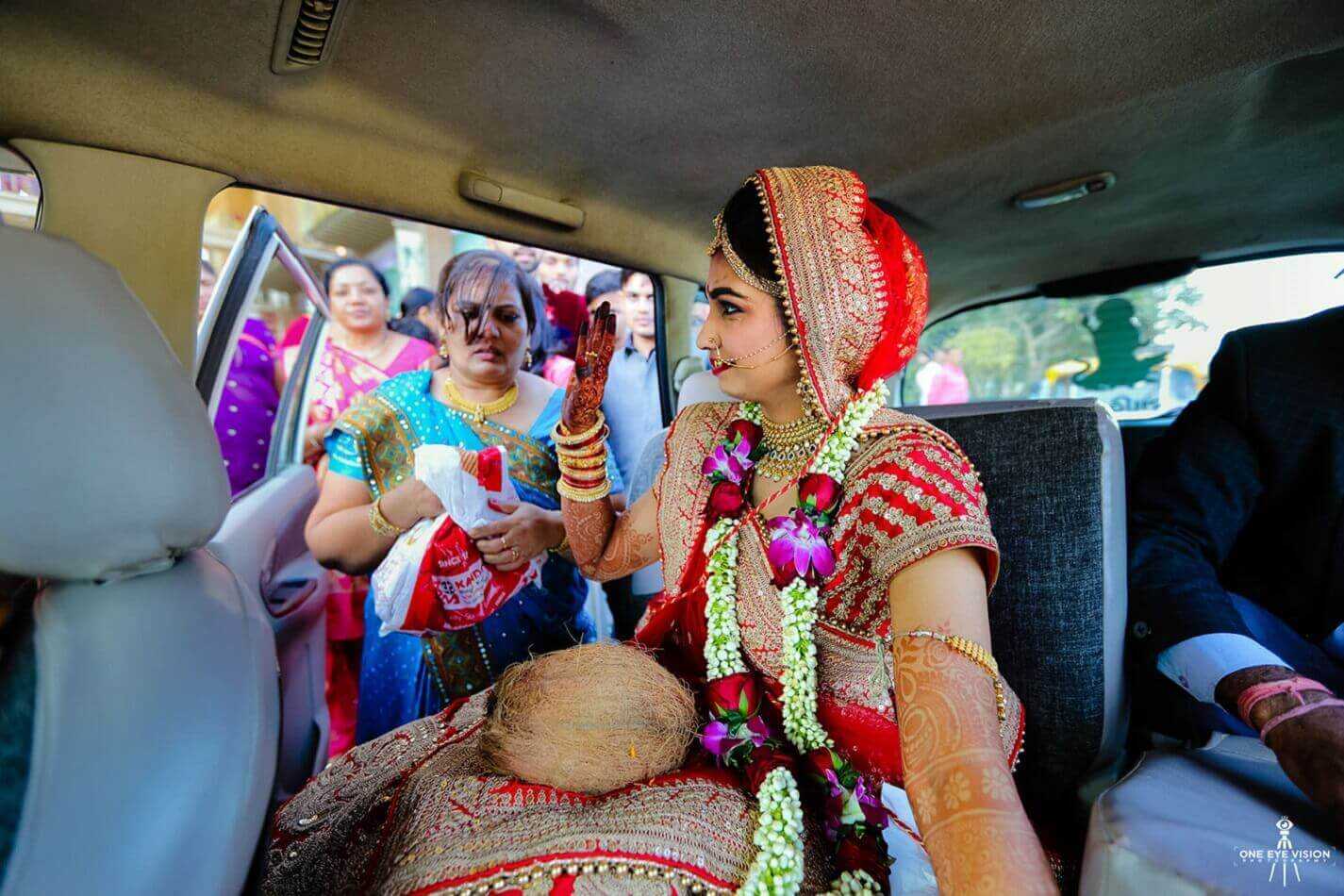 Традиционно одеянием невесты на свадебном торжестве является бардовое, красное либо золотистое индийское свадебное платье — сари, в заплетенной косой прическе ювелирные украшения и цветы. Разрез глаз подведен линией черной подводки каджал, от которой взгляд становится загадочным и притягательным. В центре лба между бровями рисуют красную точку бинди сакральный знак замужества. Пробор в волосах синдур подкрашивают растительной краской красного оттенка и надевают мангтика, особое ювелирное украшение.