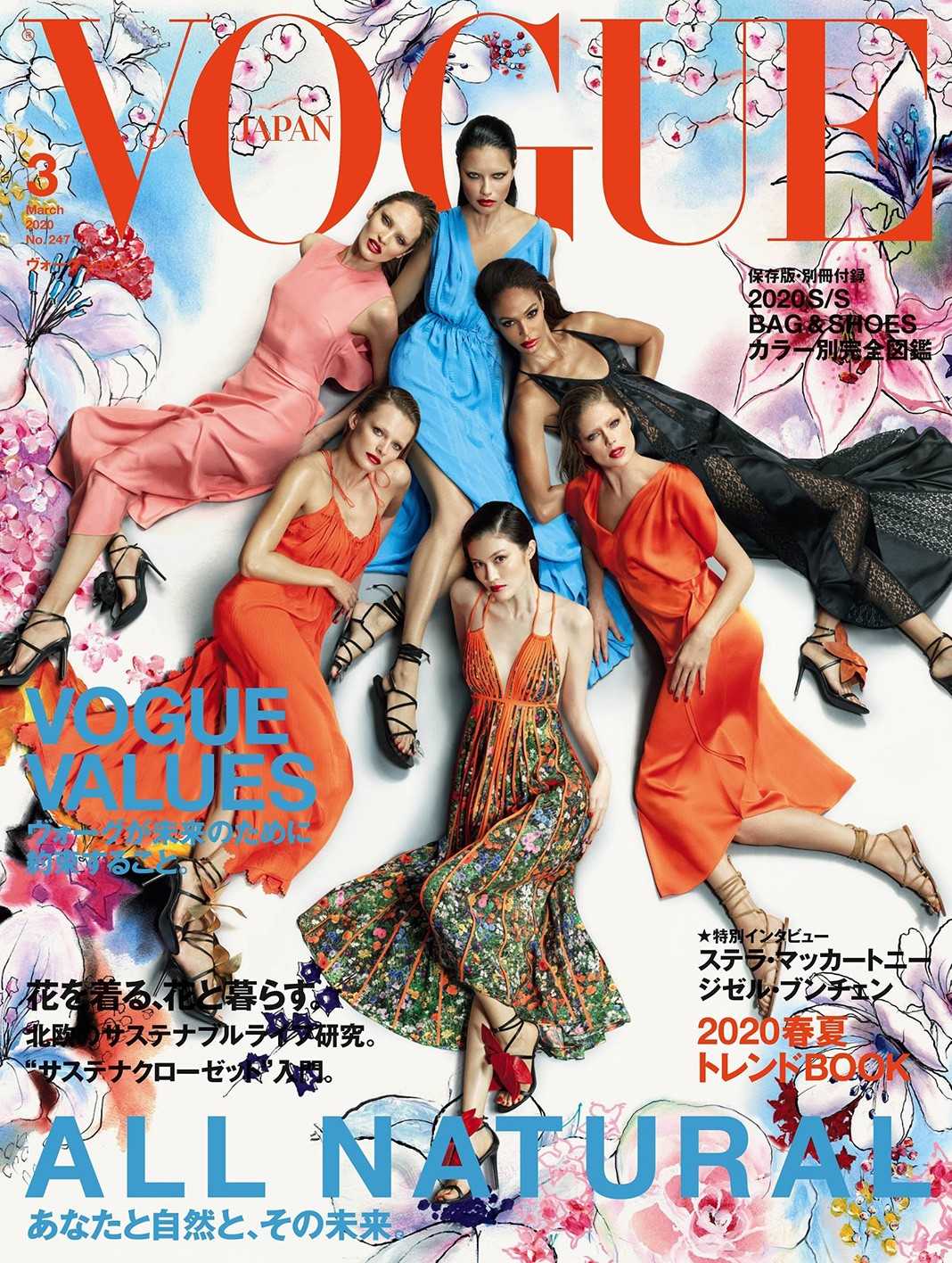На обложке журнала Elle Singapore, сентябрь 2019 г. Кэндис Свейнпол, Адриана Лима, Джоан Смолс, Эдита Вилкевичуте, Суи Хэ, Даутцен Крус в платьях Stella McCartney на обложке журнала Vogue Japan, март 2020 г.