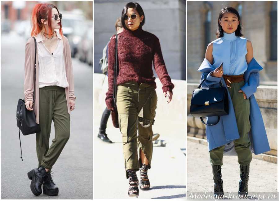 Дополнения – белые и камуфляжные футболки, свитера, черные или защитные пуловеры, толстовки. Головные уборы – фуражка, бейсболка, берет. Обувь – берцы, высокие сапоги, коричневые или серые ботинки, кеды, кроссовки. Сумки – объемные, почтальонки, рюкзаки.