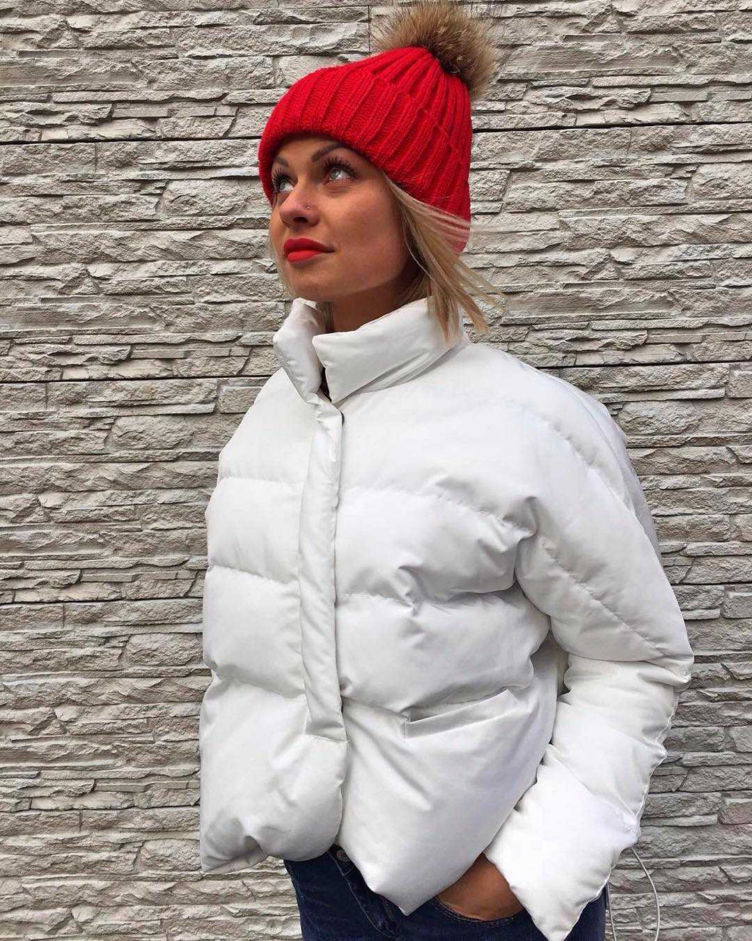 Под короткий пуховик подойдут лаконичные модели спокойных оттенков с незначительными украшениями в виде лого, надписей или маленькой броши. Особенно модно выглядит сочетание короткой куртки с шапкой-носком.