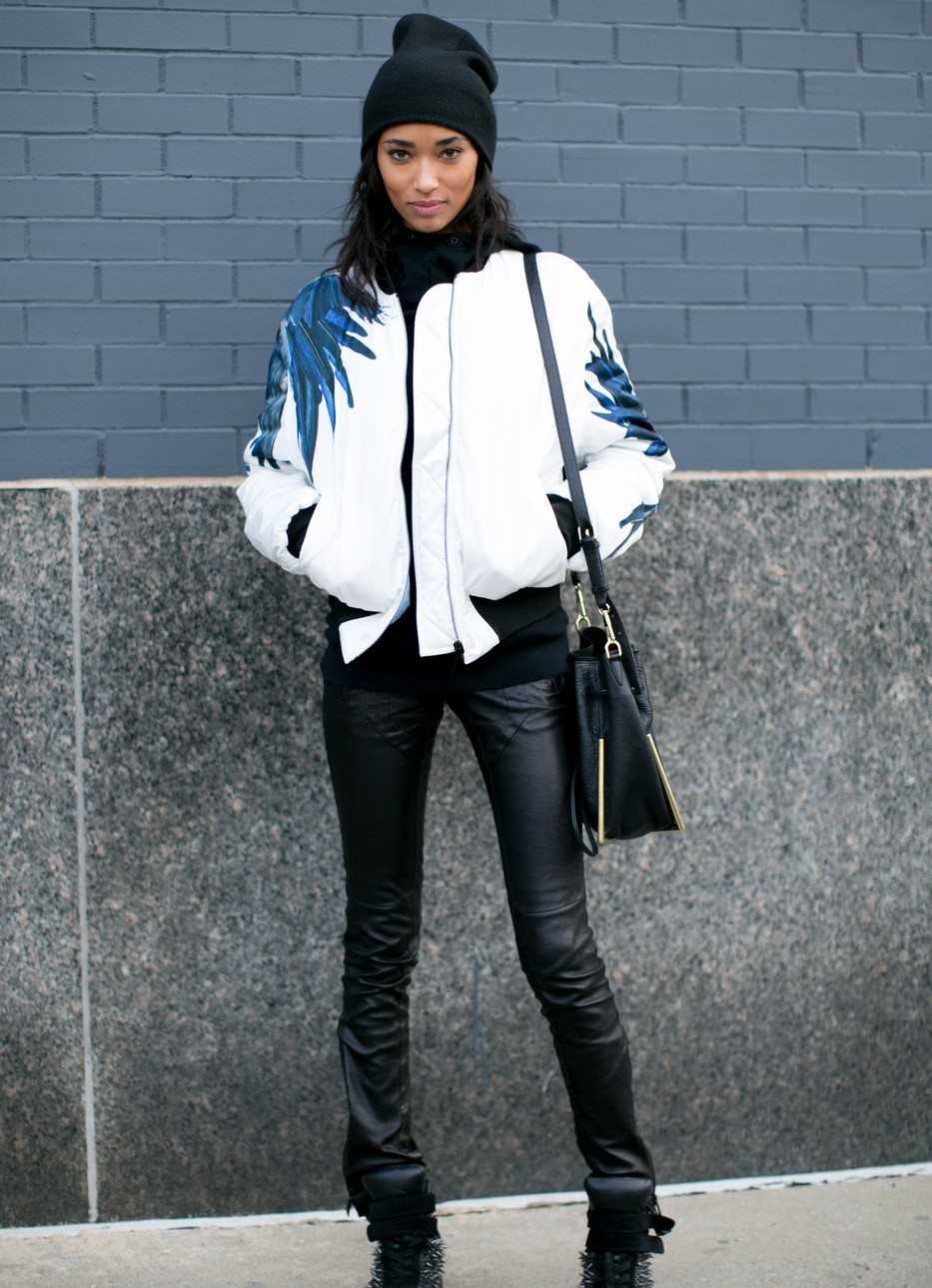 Чем ближе зима, тем чаще мы встречаем на фото стритстайлеров одежду из экокожи. Особенно эффектно смотрится сочетание пуховиков-оверсайз со стильными леггинсами. Объяснить это довольно просто. Материал не только эффектно выглядит, но и отлично защищает от ветра, холода, высокой влажности. Поэтому рекомендуем обязательно примерить такой аутфит с леггинсами, объемным свитером.