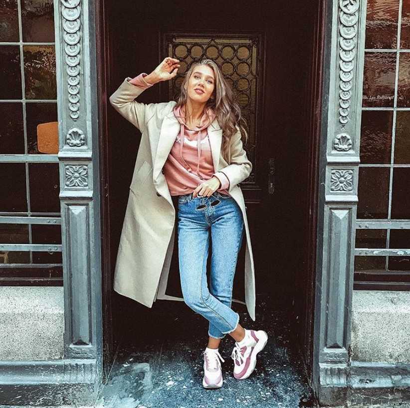 Спортивный практичный лук, в который гармонично впишется тренч спокойных оттенков (бежевый, хаки и др.).