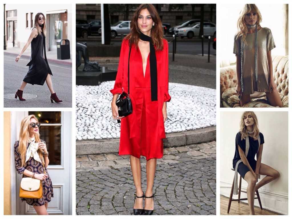 Длинный шарф, намотанный вокруг шеи с ниспадающими свободными концами отличный вариант для платья.
