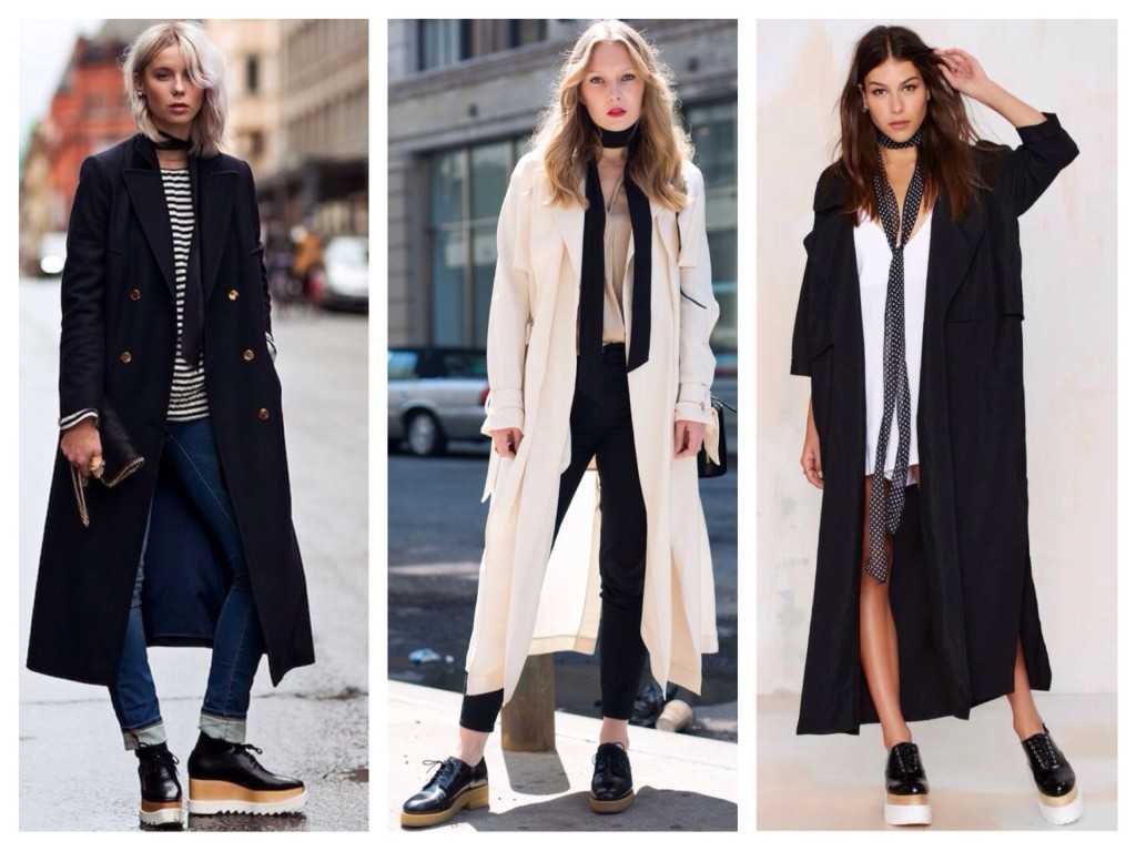 Ботинки на сплошной подошве и пальто с прямым силуэтом отлично дополнит шелковый тонкий аксессуар. Строгость и изысканность говорят сами за себя, ничего лишнего.