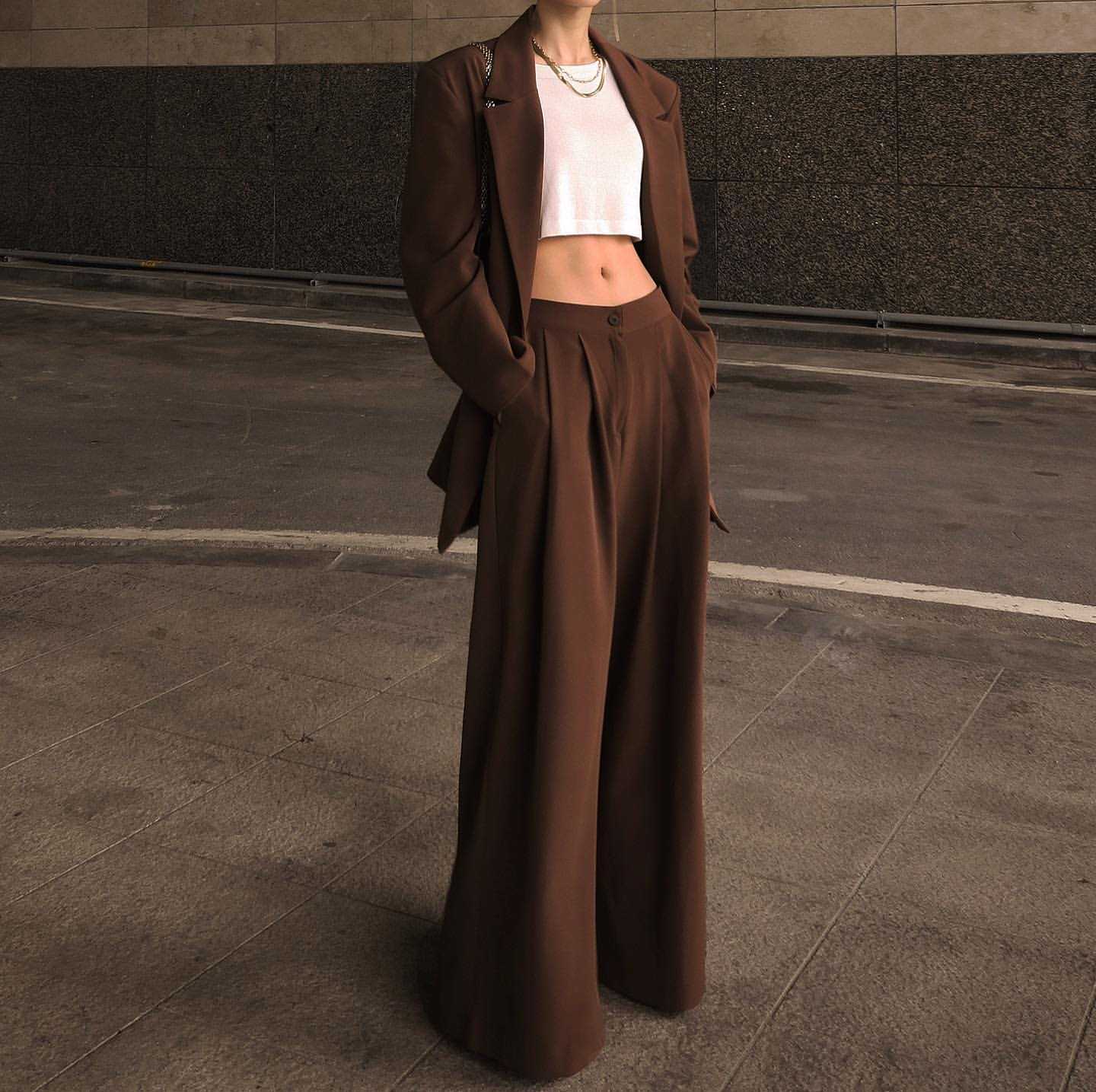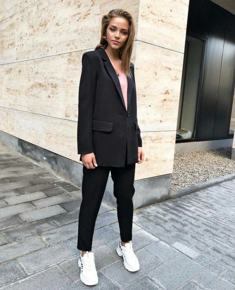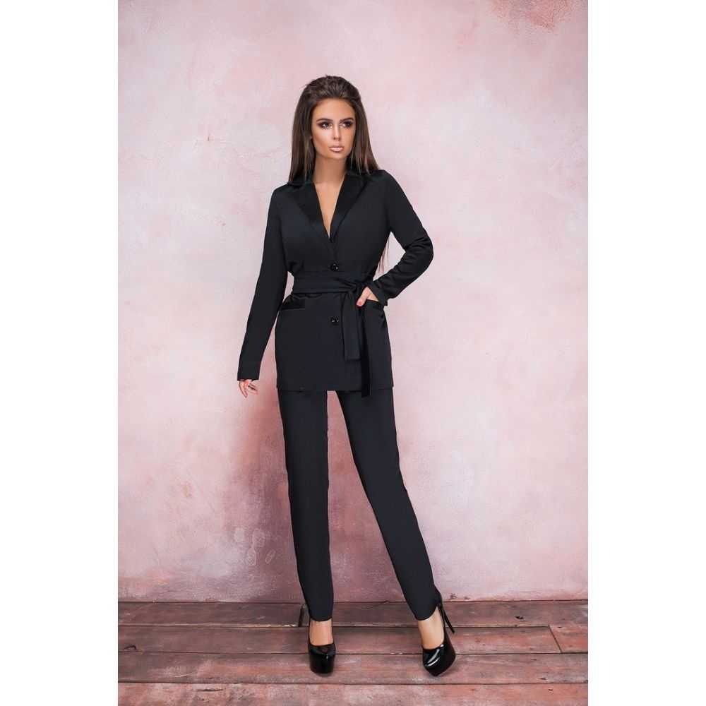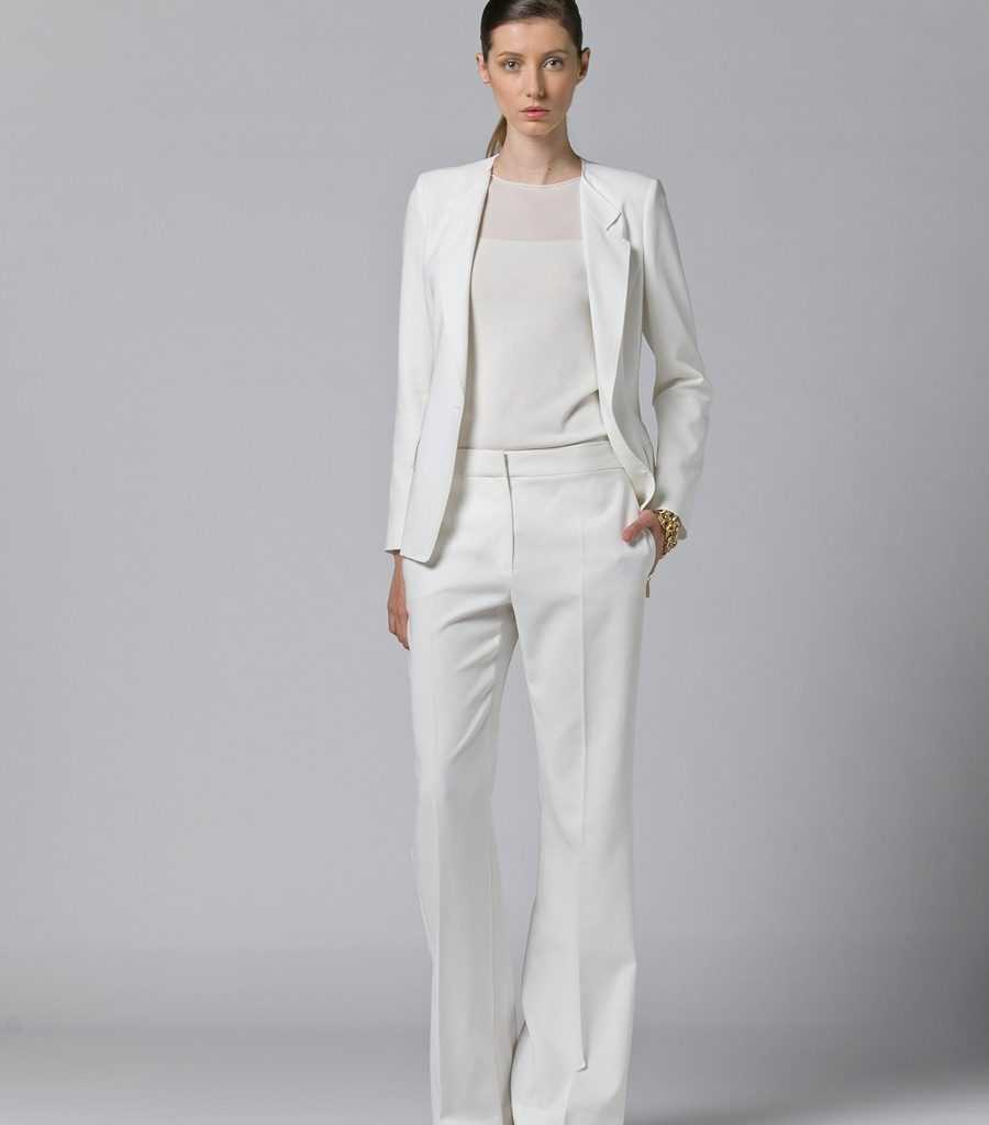 Более женственным является костюм, где узкие брюки книзу чуть расширяются, а сверху приталенный жакет. Стиль Шанель, где узкие брюки сопровождаются пиджаком без воротника. А также в сезоне 2023-2024 модно штаны-трубочки и чуть удлиненный пиджак.