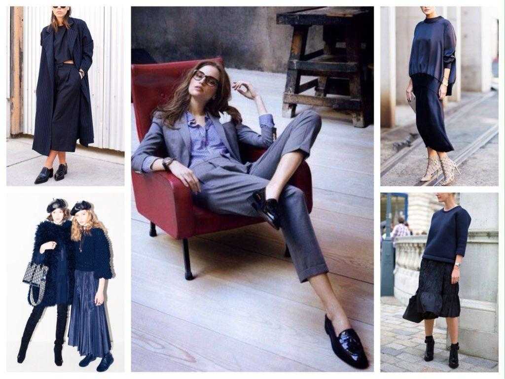 Отличные комплекты можно составить, если тотальным выбрать темно-синий цвет, яркий нэви, припыленный синий и голубой.