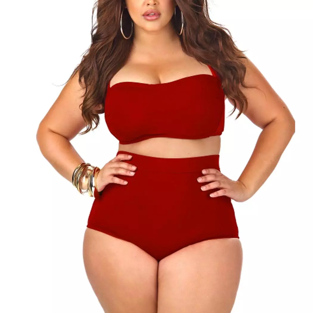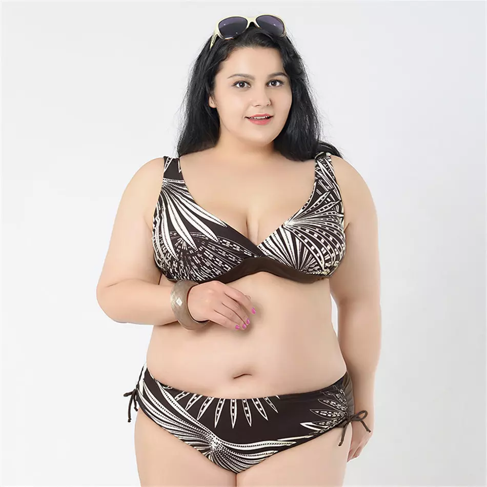 - Крупным красавицам не нужно брать слишком яркую расцветку купальника. Не рекомендованы модели с поперечными орнаментами и мелкими принтами.