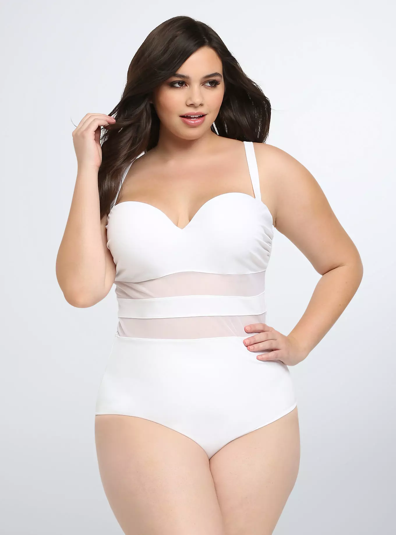 Белый цвет – классика жанра, которая подойдет и пышногрудым худышкам, и полным леди. К тому же, под такую ткань хорошо проникает солнечный свет, кожа сможет немного загореть.