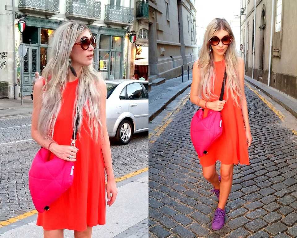 Очень неоднозначное решение, как носить красное платье, это сумочка-сердечко и кеды различных оттенков лилового. По всем законам такая палитра неудачное сочетание, но наложение его на легкомысленное платьице дало неожиданный эффект. Созданный образ вполне девичий, и достоин повседневной носки.