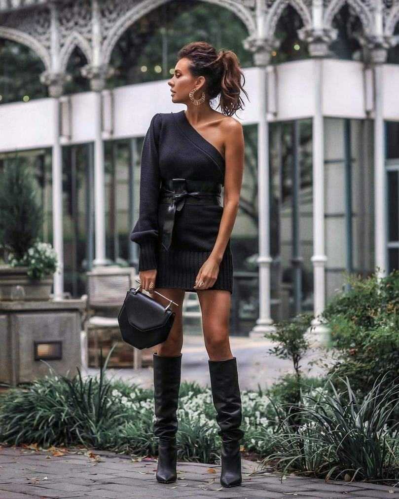 На вечеринку можно надеть кожаные ботфорты черного цвета, они сделают образ ярким и эффектным.