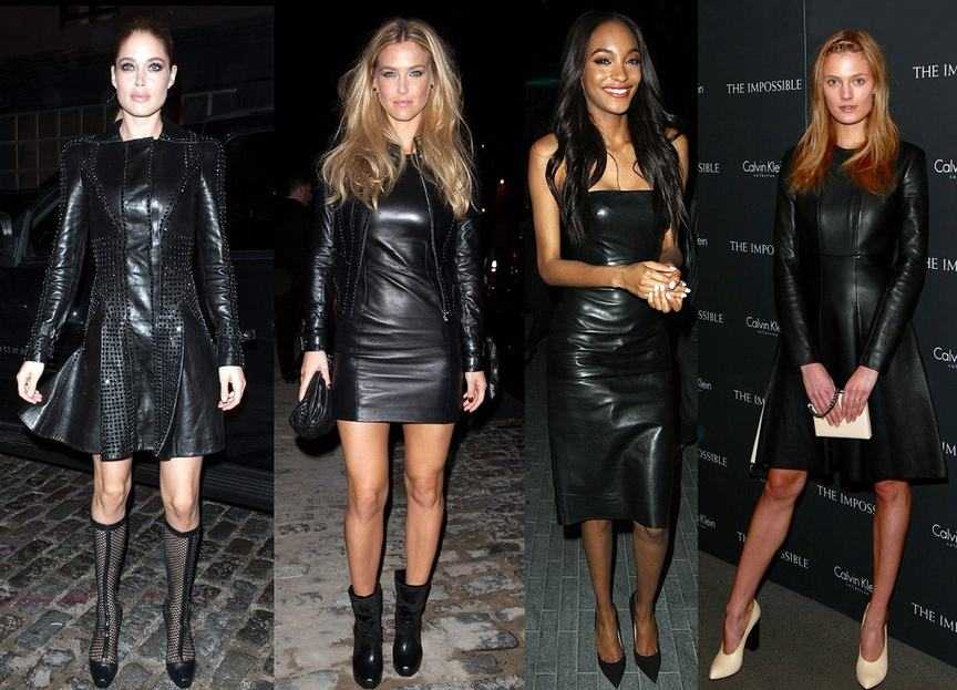 Черное кожаное платье, слегка прикрывающее колени – любимая модель многих знаменитостей. Маленькая сумочка контрастного цвета, черные туфли лодочки или босоножки на высоком каблуке прекрасно дополнят наряд.