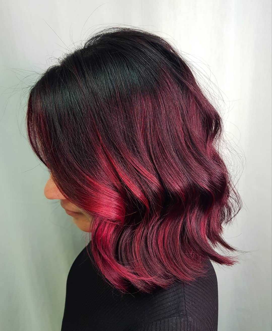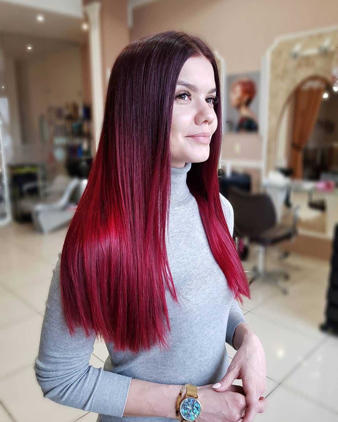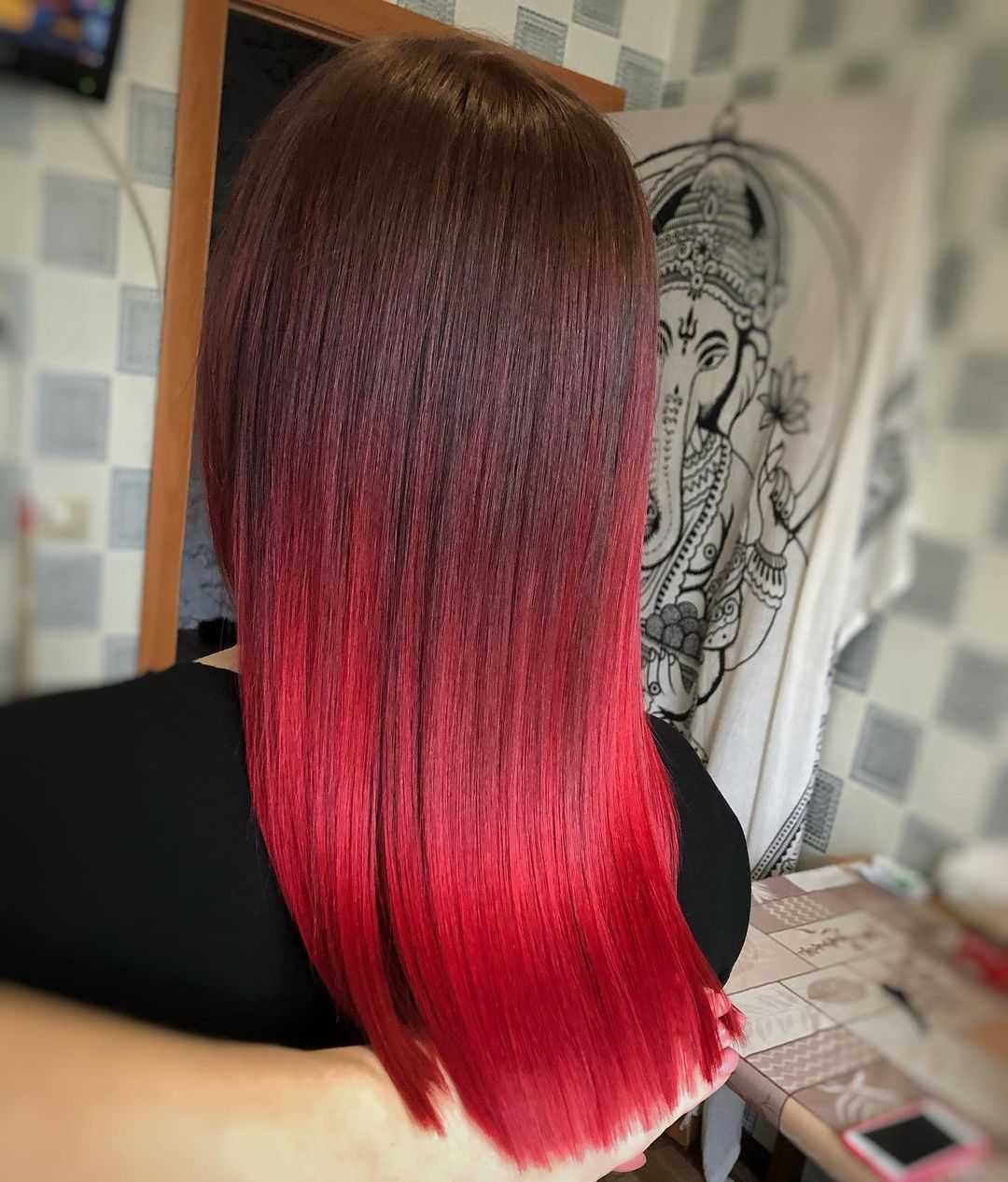 Красный градиент выглядит завораживающе и на длинных, и на коротких волосах. Комбинировать можно абсолютно с любой палитрой, такой как оранжевой, зеленой, голубой. Смелым можно поэкспериментировать с окрашиванием в виде радуги.