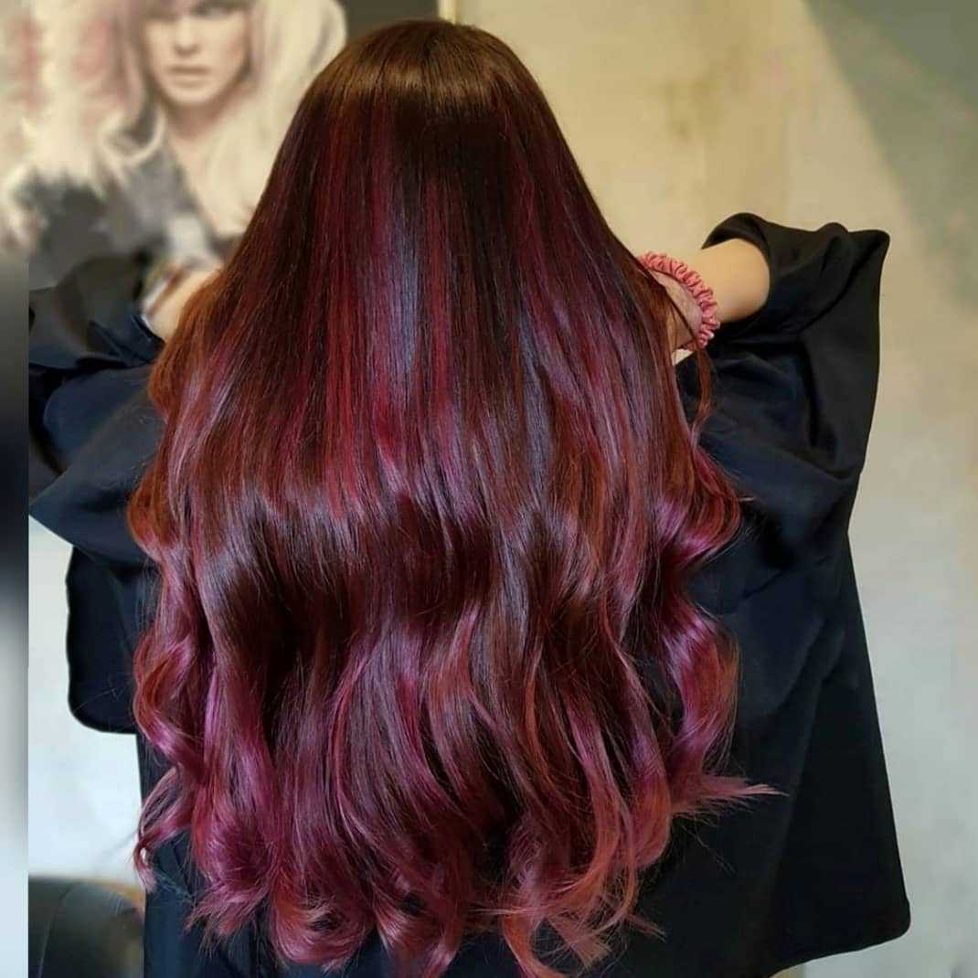 Мягкий переход красной краски в балаяже от кончиков до корней волос создает эффект одновременной естественности и яркого образа. Красное мелирование и шатуш ни чем не отличается от натуральных цветов. Здесь также может одновременно сочетаться несколько оттенков красного, например, малиновый и алый цвет прядей.
