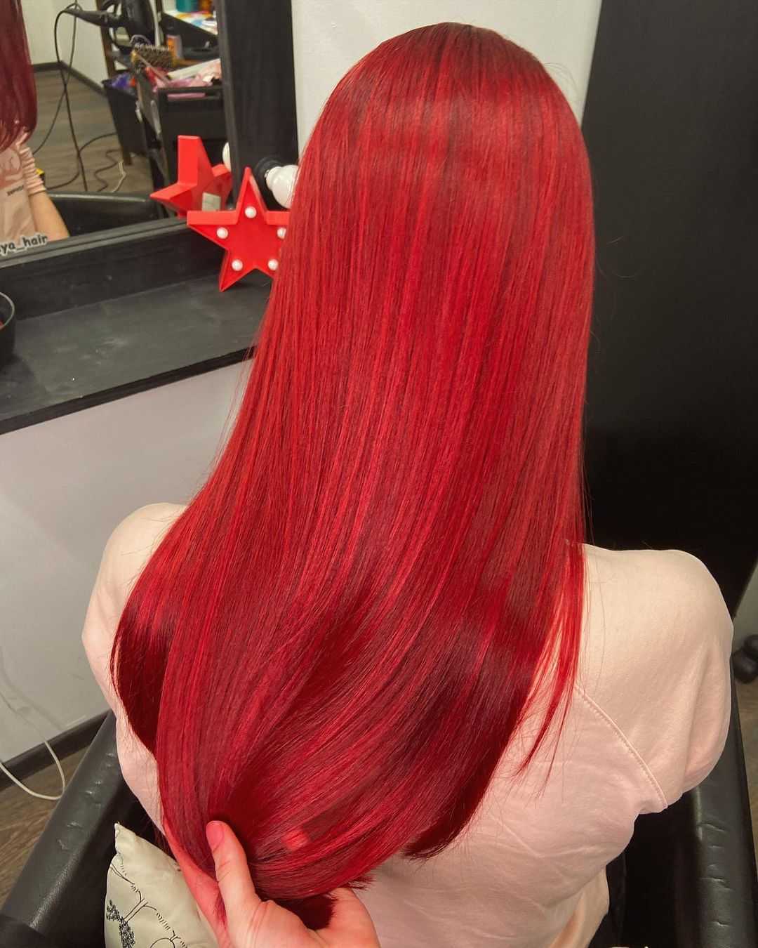 Окрашивание всех волос в единый цвет выглядит очень ярко