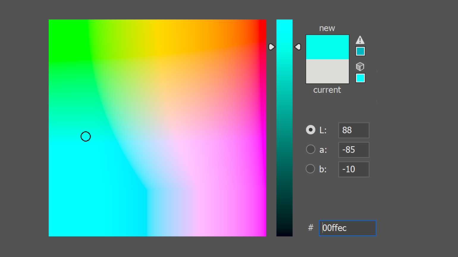 Давайте, например, возьмём бирюзовый цвет и взглянем на него на диаграмме. Значение L показывает светлоту. Значение а — то, что он ближе к зелёному, чем к красному. Значение b — что в нём больше синего, чем жёлтого: