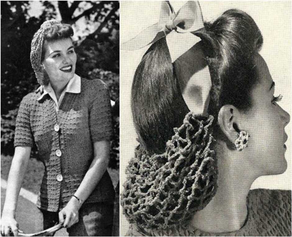 В тяжелые 40-е годы кроше стало самым дешевым (а порой и единственным) способом украсить старые вещи. Женщины крючком вязали накладные воротнички и манжеты, свитеры и кардиганы. В моду активно входили тюрбаны и сеточки из кроше.