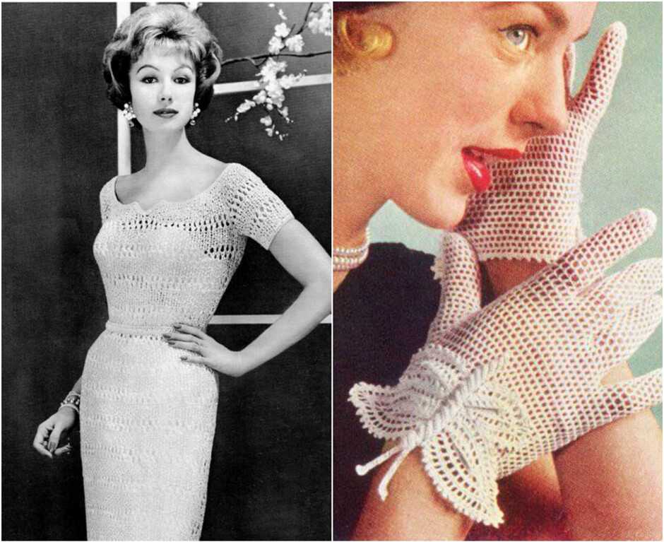 В 50-е интерес к кроше не прошел. Кружево прекрасно уживалось с новой модной эстетикой и подчеркнуто женственными силуэтами. Кроше становилось не только декором нарядов, но и выступало основным материалом для платьев, шалей, сумочек и юбок. Кроше было очень популярно в свадебной моде эпохи: поскольку до начала 50-х во многих странах сохранялся режим дефицита на ткани, люди создавали наряды из подручных средств.