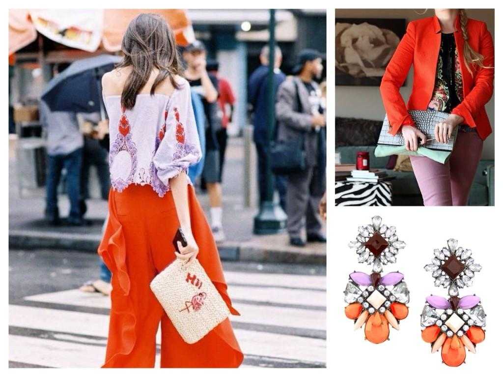 - Лиловый с оранжевым. Очень удачное комбинирование. Светлый персик, яркий апельсин или коралловый – лучшие оттенки для удачного образа.
