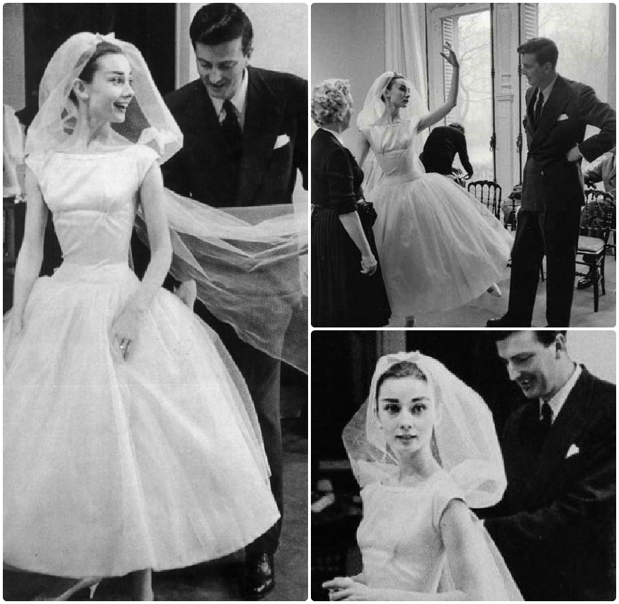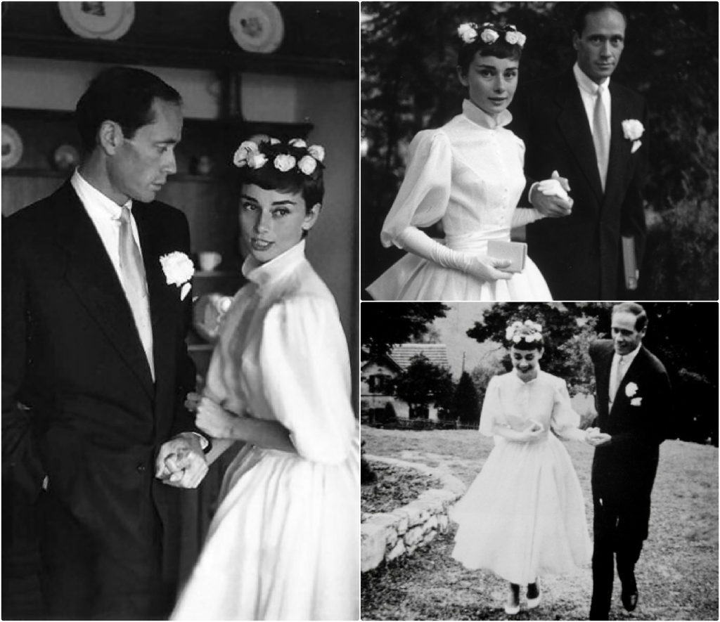 Свадебные наряды самой Одри были куда более удачными, чем ее браки. Оба официальных замужества актрисы закончились разводом. Первый раз Одри связала себя узами брака с известным голливудским актером Мелом Феррером. Их свадьба состоялась в Швейцарии в 1954 году и стала не только одним из самых ожидаемых событий в мире шоу-бизнеса, но и памятным моментом в истории моды. Эльфийский образ невесты придумал знаменитый французский кутюрье Пьер Бальмен. Возможно это белое платье длиной до щиколотки с воротником-стойкой, подчеркнутой талией и длинными шифоновыми рукавами не стало бы столь заметным явлением, если бы не милый венок из свежих цветов, украсивший голову невесты. Будь выбрана традиционная тиара с фатой или вуаль, образ не получился бы столь трогательным и романтичным.