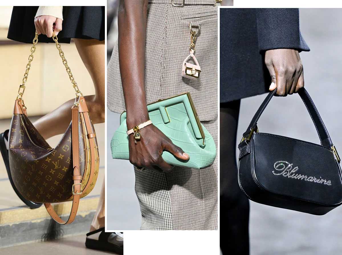 Модели сумок в 2022-2023 году дизайнеры предложили в огромном разнообразии – от классических, повседневных, до экстравагантных и минималистичных. В цветовой гамме преобладают изделия оранжевого, сиреневого, кирпичного цвета. Особым шиком станет соответствие материала сумки и основного наряда – букле, с гобеленовым принтом, денима.