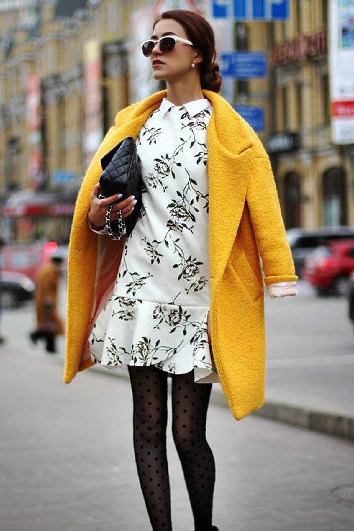 Цветочные платья — хит прошлого лета, они так полюбились дизайнерам и модницам, что стритстайлеры стали носить их и в холодное время года. Их можно смело использовать как юбку, надев сверху толстый объемный свитер или кардиган. Чтобы утеплиться снизу — под платье надевайте колготки и/или ботфорты.