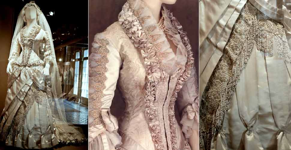 Траурное платье справа носила королева Виктория, «оно показывает традиционные элементы траурного наряда, которые она носила ее с смерти ее мужа, принца Альберта (1819–1861), до самой своей смерти ».