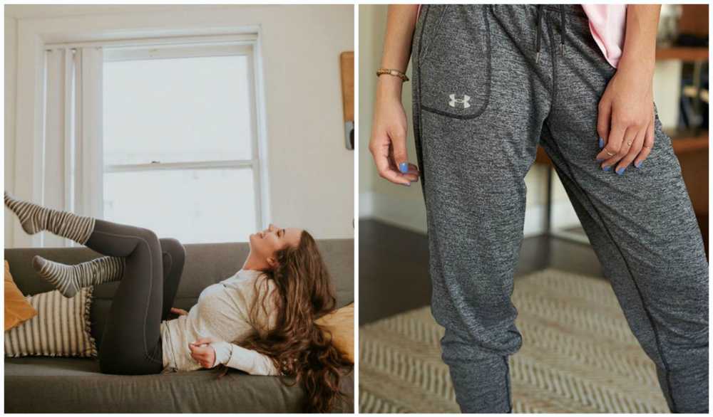 Самое первое, что приходит в голову, — трикотажные брюки. Они могут быть любыми: спортивные, багги, легинсы, почти классические.