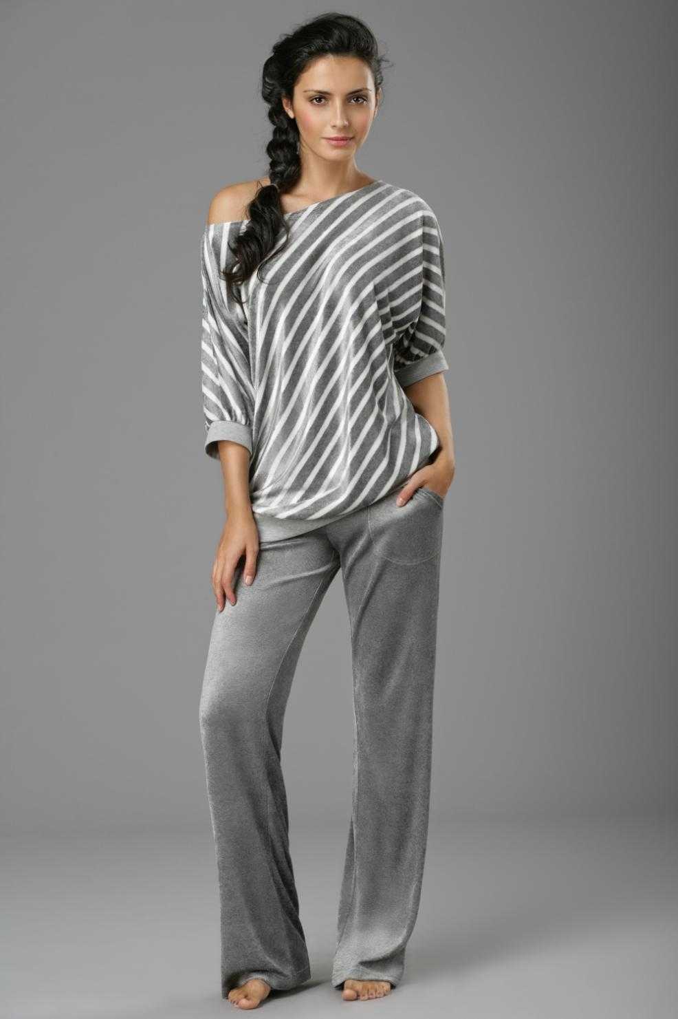Для осени, зимы и весны подойдут костюмы с брюками из велюра, трикотажа. В них удобно заниматься домашней работой.