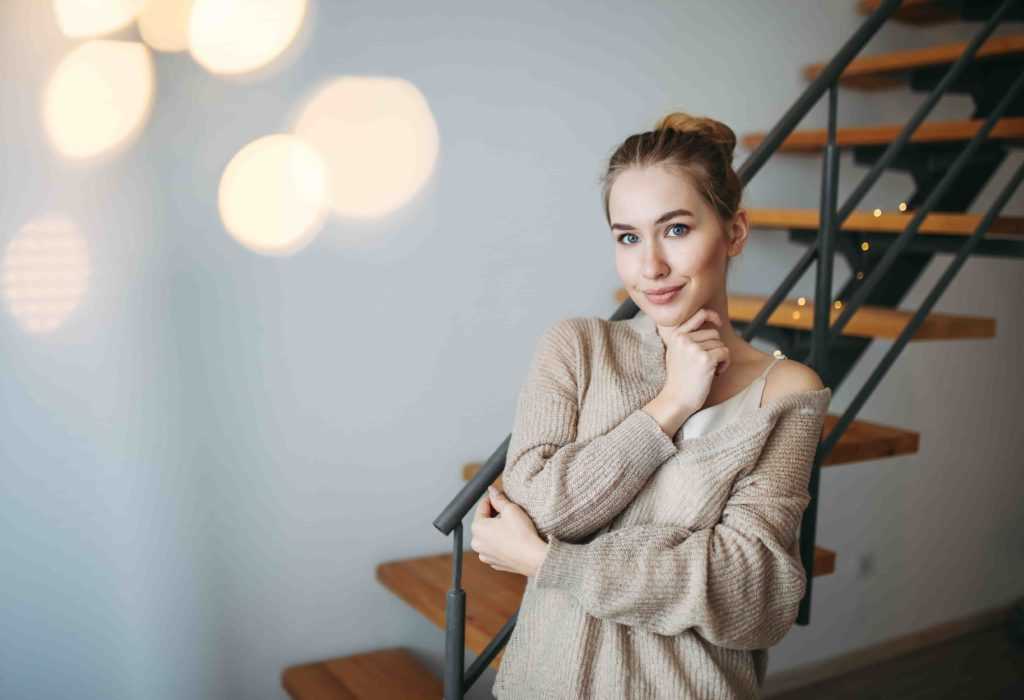 Чтобы выглядеть стильно и женственно, лучше приобрести объемные свитера. Они хорошо сочетаются с лосинами и джинсами. Или длинную тунику, вязаное платье или костюм. Чтобы ногам было тепло, не забудьте о трикотажных колготках.
