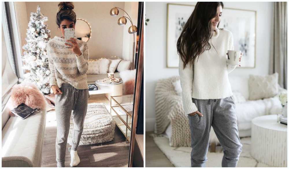Для зимы предпочтительней теплая одежда, не делающая фигуру громоздкой и не стесняющая движений. Халаты, комбинезоны, уютные пижамки, спортивные костюмы, мягкая туника с длинным рукавом и леггинсы — все это подходит для создания зимних образов хранительницы очага.